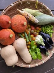 どれもこれもタネから育てた野菜たちなのですね✨ お茄子のツヤツヤしてること!! ひょうたん型のは、バターナッツかぼちゃ🎃でしょうか、好きなんです〜✨