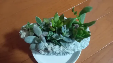 自力で多肉の寄植え🌿🔰 サボテンも枯らしてしまう私ですが、皆さんの多肉の寄せ植えを見ていたらどうしてもやってみたくなって🌿😊大谷石の鉢ですやり方をネットで調べたり、多肉を買った時の説明書を見たり😅悪戦苦闘の末入れ終わりました😆せっかく多肉用に買った鉢なので植えてみましたが、穴が空いてないのでダメかもしれませんが🥺上手にはで
