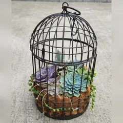 カインズで買った鳥かごにココヤシファイバーを敷き、砂を入れて寄せ植えしました!吊るして飾れる場所を作ってグリネ類をもっと増やして垂れるようにしたいです!