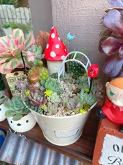■作品内容多肉の箱庭風寄せ植え『森の中のきのこ🍄のお家🏠❤️』■工夫ポイント森の中にあるお家をイメージして葉挿し苗で寄せ植えしました😊 以前インスタのプレ企画で当選した箱庭セットの小物を使って寄せ植えしました❤️赤いきのこのお家ポスト電灯ミルク缶小鳥ガーデンアーチみんなとっても可愛い小物た