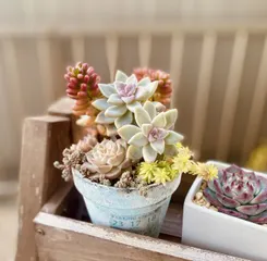■作品内容3年目の多肉■工夫ポイント ■材料 デコパージュしたケース(購入した物)お一人様の多肉■工程お一人様の多肉を並べただけ🤭枯らすのが得意な私ですが、3年目を迎える多肉🤗これを買った時に、1週間に1度の水やり、その日を忘れたら次の週まで水やりはしない。と教わり、ずぼらぬ私にはピッタリ
