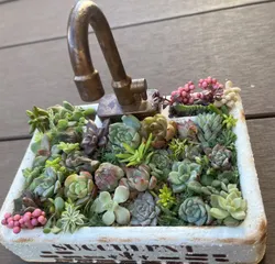 初めての多肉寄植え 先日作ったSeriaままごとキッチン 流し台に多肉の寄植えをしてみました(並べただけ…)皆さんのようにモコモコと立体的にできない(T . T)皆さんの作品を見てもっと学ばなければ ( ㅎ.ㅎ)ジー