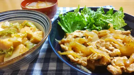 焼肉のたれにチューブのショウガをブチューと入れて、生姜焼きのたれにしました。少しこってり味の生姜焼きになりました。生姜焼き用の肉だと思って解凍したら、豚しゃぶ用の肉でした(((*≧艸≦)玉ねぎでかさ増ししました。他は、白菜と厚揚げの煮物と、冷蔵庫の野菜室の半端な根菜でつくった味噌汁です。まあまあ頑張