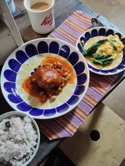 今朝はスパニッシュオムレツ⁇ 今朝は昨晩の残りのトマト煮込みハンバーグと勝手にスパニッシュオムレツと思ってるホウレンソウとピザチーズを混ぜて作っていただきました✨これから支度してB&B行って来ます✨😊
