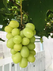 シャインマスカット収穫 ■作品内容育て始めて10年目!!やっとここまでの大きさのマスカットが収穫出来るようになりました!■こだわりポイントブドウに雨や虫がつかないようにブドウ棚を作り、試行錯誤しながらも、やっと粒の大きなマスカットが収穫できるようになりました!最初は一年苗で幹の太さも割り箸ほどだったものが、今では太くなり、