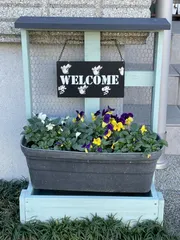 玄関先に❣️ 以前、WSで作った後ろに金網のついているプランターカバー❣️ビオラが反日影の所で頑張ってます!ウェラカムボードは、100均です!