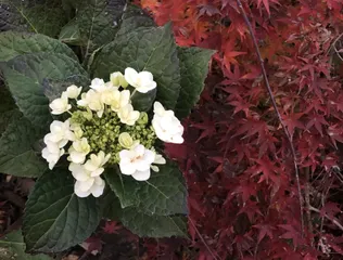 紫陽花ウェディングドレス♪ モミジも散り始めるこの季節。紫陽花、ウェディングドレスがまだ咲いています。(12月6日)赤いモミジに真っ白な紫陽花、綺麗ですね〜でも今朝の霜が当たったら白い額が透明になっちゃった。また来年!