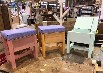 収納付きスツール この生地、とても良いですね!!参加メンバー全員こちらの生地使用💁♀️張り替え時のレクチャーを受けながら、スタートしました。ボックスの内側に、貫通穴を開ける所を慎重に、、。別売りで、チェーン⛓購入し、内部に取り付けました。同席の方とお揃いです♫楽しい時間を過ごせました事に感謝申し上げます
