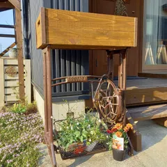ミシン脚のプランターBOX もとはこれ↓なのですが実用したかったので、思いきって解体しました。中にアンティークなミシンが入ってました。安価な野地板や家にあった余り材と、四隅は端材を錆びペイントでアイアン風にしてみました。肝心のグリーンはまだ飾れてないので頑張ります💪
