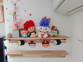 浮かせる家具ブラケットを利用して棚を作りました。 上の棚は季節のイベント棚にして今回は節分です。イメージに合う鬼が居なかったので子供のぬいぐるみに鬼になってもらいました。 お正月はダルマや門松や鏡餅などを飾りました