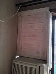 窓エアコンカバー ここに飾りをつけようと思います😊窓エアコンの上部のカバーが外れてしまいエアコンもまだ使えるので杉羽目板でカバーを作りました外側はアルミの保温材をタッカーで止めて遮熱しました
