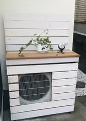 エアコンカバー 夏におおかた完成しましたが、いろいろ不備がありました🥲 暑くてジグソー出したくない! 無塗装部分がいっぱい! 板が一枚足りない! etc やっと最近完成です!!