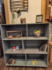 キッチン収納棚 今日は、前から作りたい〜と思っていた作品がやっと作れました🤗色は、超撥水のダスティーグリーン🥰沢山たまったグッズを飾りたくて🤗暑くて片付けが進む自信がありませんが、好きなグッズを早く整理したいので、頑張ります🤗スタッフさん、参加者のみなさん、楽しい1日をありがとうございました🤗また、宜しくお願いしま