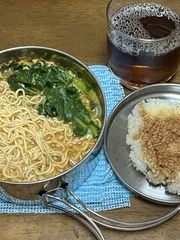 ストーブを使ってキャンプ飯もどき 今日は雨で外に出られません。なのでプリズンブレイクを観ながらストーブでキャンプ飯を作りました。ホットサンドメーカーで焼きおにぎり。クッカーを使ってかき菜と溶き卵の宮崎辛麺を作りました。ストーブの火力では時間が掛かりましたが、なんとか12時には食べられました。暖かくなったらキャンプ行きたいなぁ。
