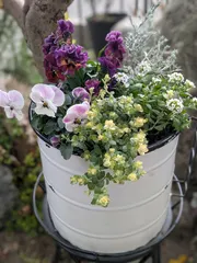 お安くフリルビオラが手に入ったので💜ヘリクリサムライムミニ·アリッサム·プラチーナを使って寄せ植えしました😊💕鉢はちょっとおしゃれなスタンドヘリクリサムはこの時期好きなお花💛好きなお花を詰め込みました🤭🎶