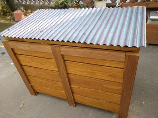 あったらいいな、と思っていた屋外用のゴミ箱カバーです。室内から窓越しに捨てたいので、背面が開くようになっています☺️ 雨が当たる場所に置くので蓋を波板の屋根風にしてみました。おうち型多肉プランターを真似たペイントです。 戸当たりゴムで屋根に傾斜を付けました。表から見るとちょっと見