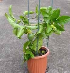 挿し木のパッションフルーツの植え替え 寒くなってきたので鉢を大きくして支柱を立て形を整えました😊🎶現在2つの実がなっています😉💕🎵