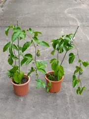 今年の挿し木パッションフルーツ 2本共に人工受粉が成功して結実し今4cm位の大きさです😊🎶右側の苗はお友達か取りに来てお嫁に行きました😉💕🎵