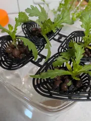 ■育てた野菜春菊 ■エピソード(チャレンジしたきっかけなど)間引した子が勿体なく思えて、キッチン栽培してみました。鉢底ネットをペットボトル上部に引っ掛けて育ててます。水換えはキャップを外せば一瞬です♫ 間引直後 少し大きくなってきたので、アイキャッチの通りハイドロボール