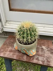 サボテン スリーコインで購入した小さなサボテンか月日のうちに大きくなり、可愛い鉢に植え替えました。3本足のソワソワポットと言う鉢です。ミシン椅子に載せてみました。ミシン椅子は載せていたカゴの跡ついて碁盤目模様になってるわ