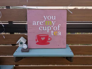 ミニサインボード 今日はミニサインボードを作りました😀カップの図柄にしようと思ってコーヒーと悩んだのですが、今回はteaカップにしました☺️バックはちょっとくすんだ🩷に。mとeは色を変えてみました🤭🤭