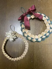 クラフトバンドでリースを作ってみました☺️形が上手く丸く出来ずちょっといびつになりましたが😅リボン🎀とドライフラワーをつけてごまかして飾ろうと思います😄✨クリスマス終わったらしめ縄にも使えそうです🎍