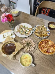 ■作品内容カナッペ 黄金比だれの手羽元ヒレ肉ステーキスープピザバスクチーズケーキ ■工夫ポイント予定変更で急遽娘宅へサプライズで旦那さんが料理を作ってくれましたせっかくなのでバスクチーズも作ると言って慌ててカインズへケーキの型購入ラスト1個だったそうです💦 新調したオー