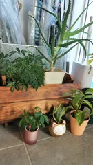 我が家の玄関 玄関に手作りの木製のプランターを置き、お気に入りの観葉植物を並べています。室内に入ると観葉植物のグリーンに癒されます。