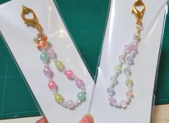 子ども作🌈ゆめかわビーズストラップ ■作品内容子供たちが祖母のために作ったビーズストラップ ■こだわりポイントビーズを通すのはもちろん、ボールチップの扱いも子どもたちがひとりでやりました。私が手伝ったのはボールチップの中に少し接着剤をつけるところ、テグスをキュッと締めるところのみ。ビーズのチョイスや並び、長さなど、子供が悩み