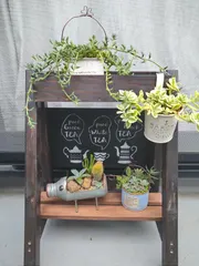 看板付き鉢置きスタンドをちょっとアレンジ 看板を後ろに付け替えて端材を置いたら前にも鉢が置けました☺️