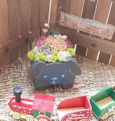 多肉の寄せ植え 先日いつものフラワーマーケットで寄せ植えしてきました😆🎶今回は自作のワンコの鉢とワイヤーのピックが映えるように植えるのが目標!! 以前ここで同じ鉢に植えた時は盛り過ぎてしっぽが全く見えなくなってしまうことがありました😅 はっ!!すぐしっぽは見えなくなりました~🤣ここで控え目に植え