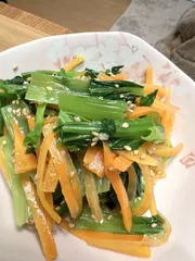 NEW 小松菜と人参のナムル ■材料小松菜 1/2束人参 1/3本・鶏がらスープ顆粒 小さじ1/3・チューブにんにく 小さじ1/3・塩 ひとつまみ・ごま油 大さじ1と1/2・炒りごま 大さじ1■作り方①小松菜は洗ってざく切りに、人参は細い千切りにしておく。②鍋に湯を沸かし火の通りにくい人参から入れ、沸騰したら小松菜の