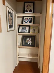 NEW フォトフレームラックの作成 ■材料 角材と平板■作り方 角材で柱を作って平板をダボで止めるだけ■工夫ポイント 高さが自由に変えられる様にダボ穴を10センチ間隔で空けてます。先日、湯婆婆さんが我が家へ引っ越ししてから床の間に置かれた湯婆婆さんの大事なご主人の遺影やご先祖様のお写真、記念写真のフレームやらが何と床に無造作に置かれて
