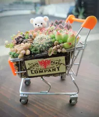 NEW 100均ショッピングカートに寄植え ■材料100均ミニショッピングカート100円じゃ無かったけどwww水切りネット針金ベニヤ板3㌢×5㌢ ■作り方ベニヤ板を塗装(写真は超撥水)デコパージュやステンシルで装飾写真の物はダイソーのダクトテープを使いました針金でカートに固定水切りネットをかけて多肉の土をいれます余分なネットは寄植え