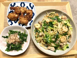 今日は上海風焼きそば、春菊のおひたし、お惣菜の唐揚げです😊オイスターソース味です!レシピhttps://diy-square.cainz.com/announcements/vbcg1irh5tpjfoa9春菊はもうラストですね💦
