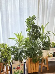WS作品と共に飾る観葉植物のある癒しの空間 ■作品内容観葉植物を飾るためにWSで作った様々な作品を活用しています。我が家のリビングはWS作品で溢れいますが、とても助かっています。ワークショップで寄せ植えをしたドラセナこの2年間ですくすくと大きく成長しています。日々の成長を見ながら癒されています。■工夫ポイント観葉植物がよく育つように窓際のレー