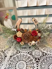 ■作品内容実際にホースランドパークで馬が使用していた使用済みの蹄鉄を使ってクリスマス飾りを作りました。■工夫ポイント錆びたりしているところはピカピカに磨き上げてから、シダーローズなどの木の実やプリザーブドフラワーのバラをメインに飾り付けをしました。蹄鉄にそのままつけにくいので予め布を貼り付けてそこに