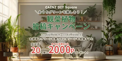おうちグリーンを楽しもう! 観葉植物投稿キャンペーン #おうちグリーンを楽しもう」を選択し投稿■注意事項※ご投稿は期間内であれば何点でも構いませんが、1作品につき1投稿でお願いします。※参加条件、参加方法を満たしていない場合は無効となりますのでご注意ください。※投稿された作品のお写真を弊社のSNS(CAINZ DIY Square、Instagram、