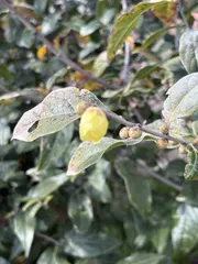 咲き始めました 暖かいからか、蝋梅が、咲き始めました。蕾もたくさんつけています 葉が落ちないとお花が目立たないですね