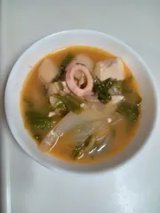 旨辛ユッケジャンクッパ風スープ使いの鍋 ■材料採れたて白菜、じゃがいも、豆腐、いか、缶のスープ■作り方採れたて白菜の心から、じゃがいもは小さめに切り先に煮始める200ccの水をいれて!豆腐はさいの目切り、イカもはワタ除いて輪切りにして、葉も食べやすく切る。5分ぐらい煮たら残りの具材を入れて、缶のスープを入れてスンドゥブを入れて蓋をして蒸し