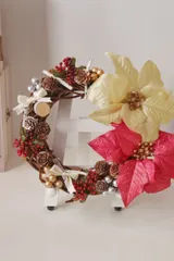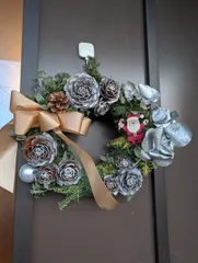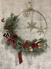 初めてのクリスマスリース作り🔰🎅 ■作品内容初めてのリースづくりで、クリスマスリースを手作りしました🎁材料はほぼ100均で揃う物ばかりなので、とてもリーズナブルでお財布に優しいリースでございます👛グルーガンが無かったのでボンドで仕上げました乾くまでに少々時間が掛かりましたが、ボンドでもくっつきました☺️これは家にあったリース 53円