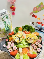 ■作品内容大根おろしで招き猫を作ってお鍋に入れました ■作品のこだわりポイント大根おろしの招き猫白はんぺんでおみくじきのこで絵馬も作りました^ - ^