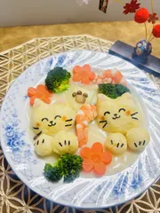 にゃんこシチュー ■作品内容にゃんこのクリームシチュー作りました ■作品のこだわりポイント猫はじゃがいもをつぶしてバターと塩胡椒で味付けして作りました