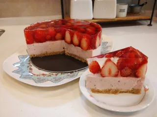 いちごの2層レアチーズケーキ🍓 ■作品内容いちご3パックを使った贅沢なレアチーズケーキ ■こだわりポイント1層目はいちごピューレ入りのレアチーズケーキ2層目はいちごをぎっしり並べたレモンゼリー レモンゼリーを注ぐ時は、一気に注ぐとイチゴが浮いてきてしまうので、少量注いで冷やして固定…を繰り返します。手間と根気が