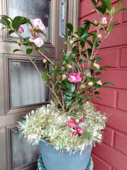 うっとりサザンカツリー ■作品内容 先日、カインズで購入したサザンカ-今川絞り-ちょうどクリスマスシーズンに咲いてきました!花がとっても可愛くて、今年はクリスマスツリーとして玄関に飾っています。■工夫ポイントサザンカの花が主役となるように、キラキラと飾りを控えめに?飾りました。 ■使用した商品サザンカ クリスマ