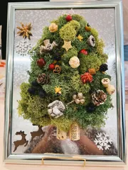 シダーローズツリー🎄 ■作品内容 うどんの箱をペイントし、シダーローズや小枝でツリー🎄を作りました✨ ■工夫ポイント 箱はうどんの箱を再利用、シダーローズはホワイトをスプレーしたものと普通の色味の2色使いで。背景のシルバーのものはコースターです🎵キラメキをクリスタルビーズで補いました✨厚みが
