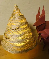 ■作品内容余った毛糸を使いました■工夫ポイントクリアファイルを円錐に作り、その上にボンドを全体に広げて、乾かないうちに毛糸(ビーズを少し通しておく)を巻いていきます。更に毛糸の上に少量、ボンドを塗り完成!中にLEDランプのキャンドルを入れてライトアップすると、とても綺麗です!