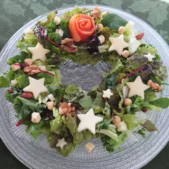 リースサラダ ■作品内容リースサラダを作りました。りんごの☆、ロカボナッツチーズ入り、スモークサーモンのバラを盛り付けました。 ■工夫ポイントクリスマスぽく、☆を沢山散りばめました。