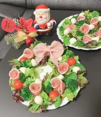 ■作品内容可愛くサラダでリース✨ ■工夫ポイントハムでリボン🎀、生ハムでバラ🌹レタス3種類使用して可愛くしました💕