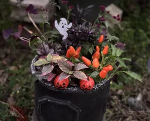ハロウィンの寄せ植え🎃 ■作品内容ハロウィン🎃をイメージして寄せ植えを作りました。■こだわりポイントオレンジの唐辛子、黒葉の唐辛子をメインにカラーリーフを寄せました。オバケピックとミニカボチャでアクセント🎃を付けました。